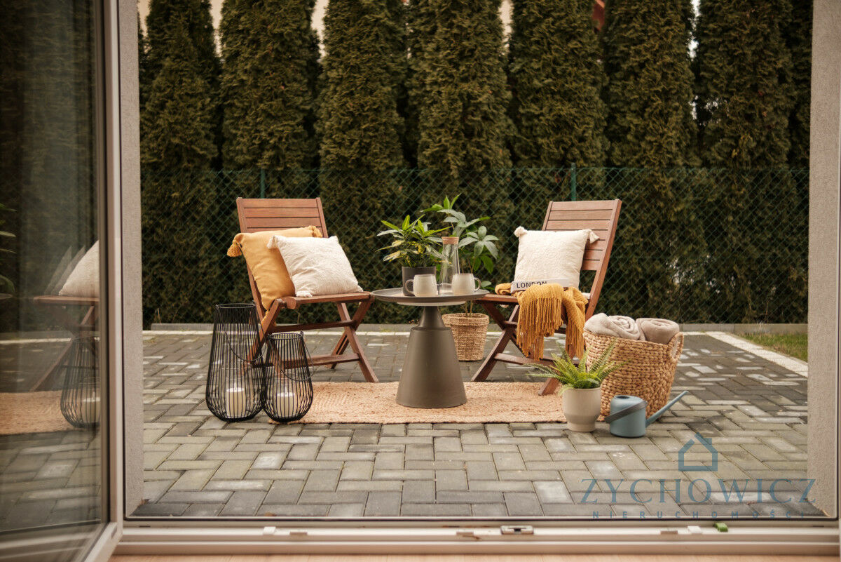 taras wyłożony kostką, z bezpośrednim wyjściem z salonu